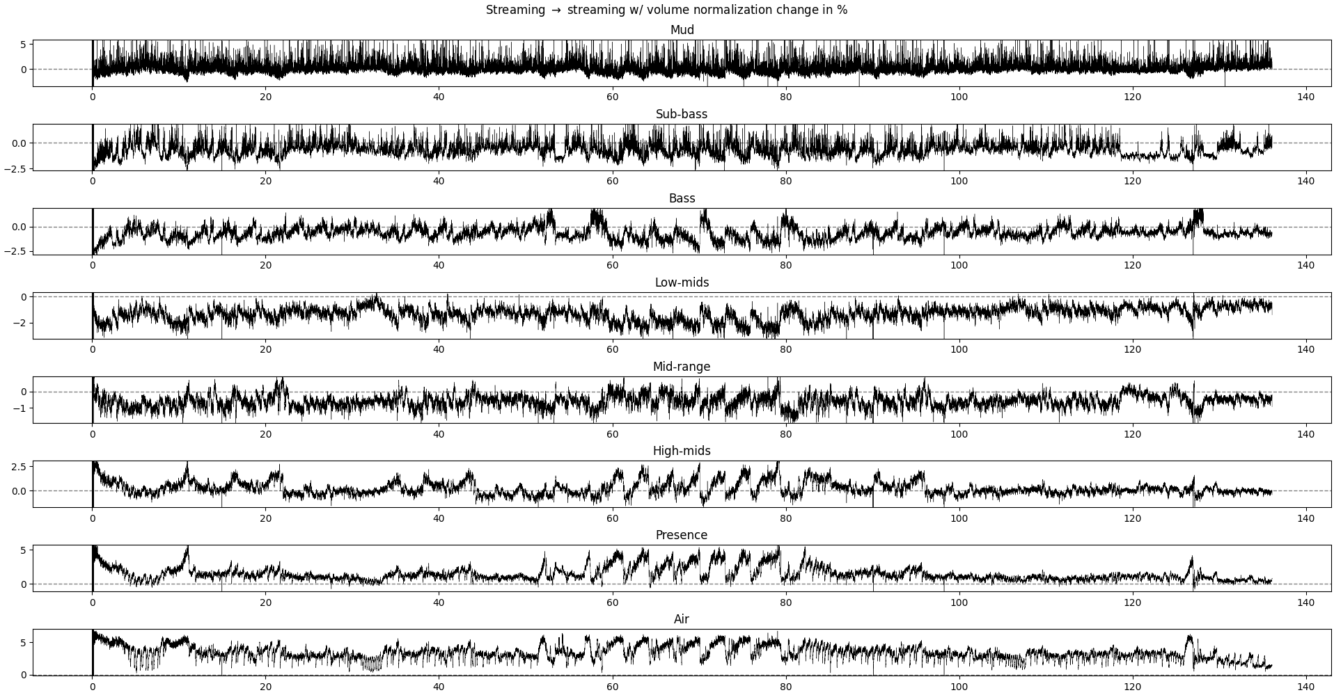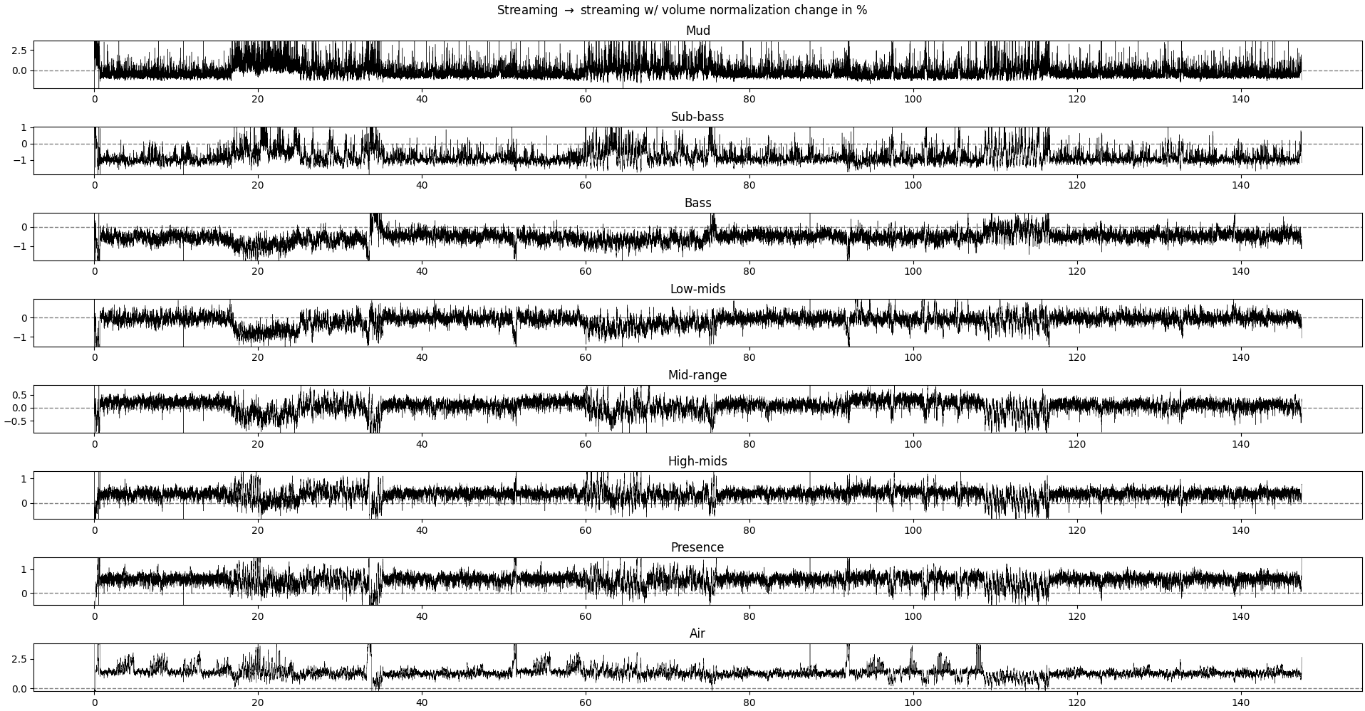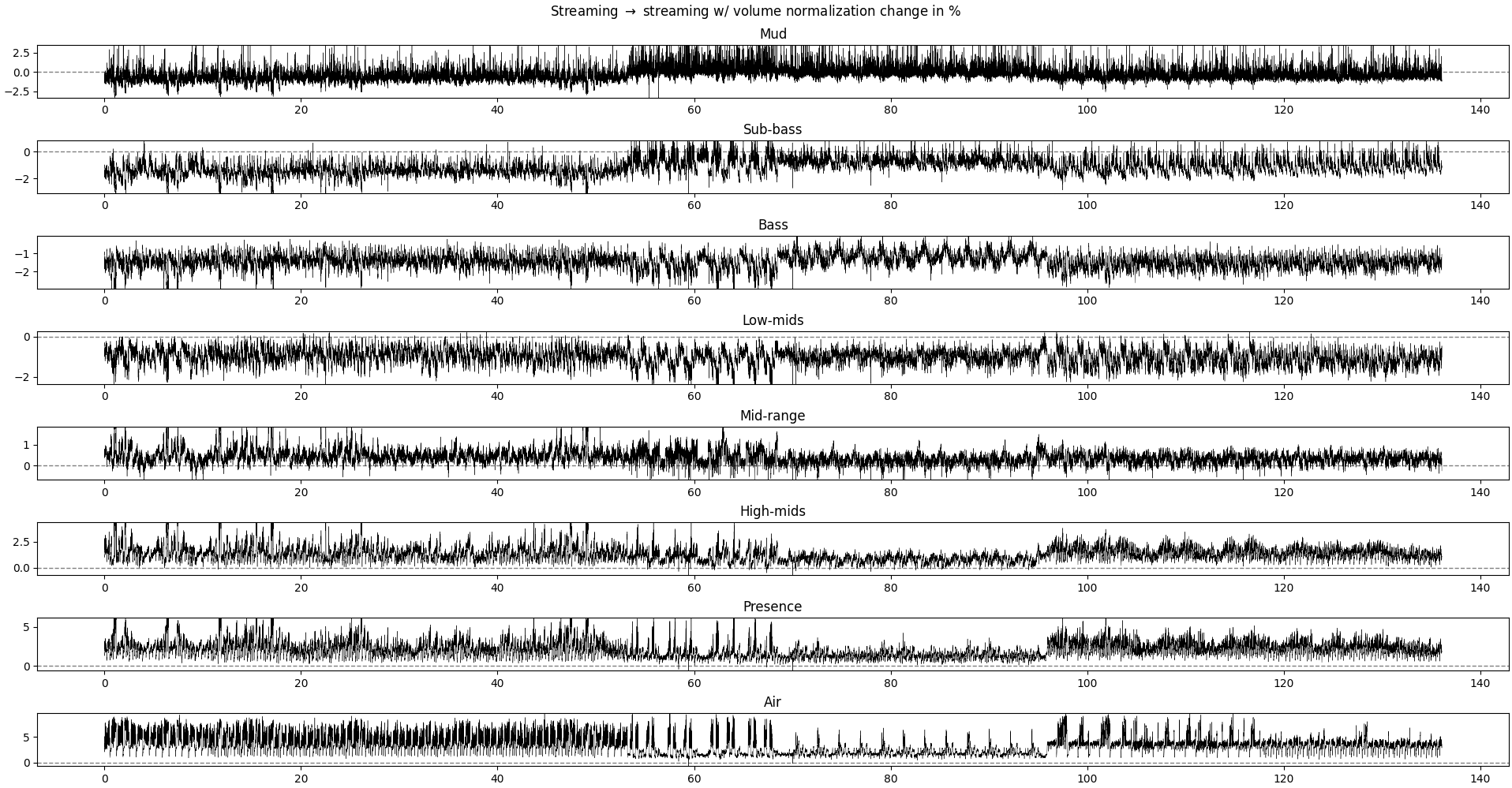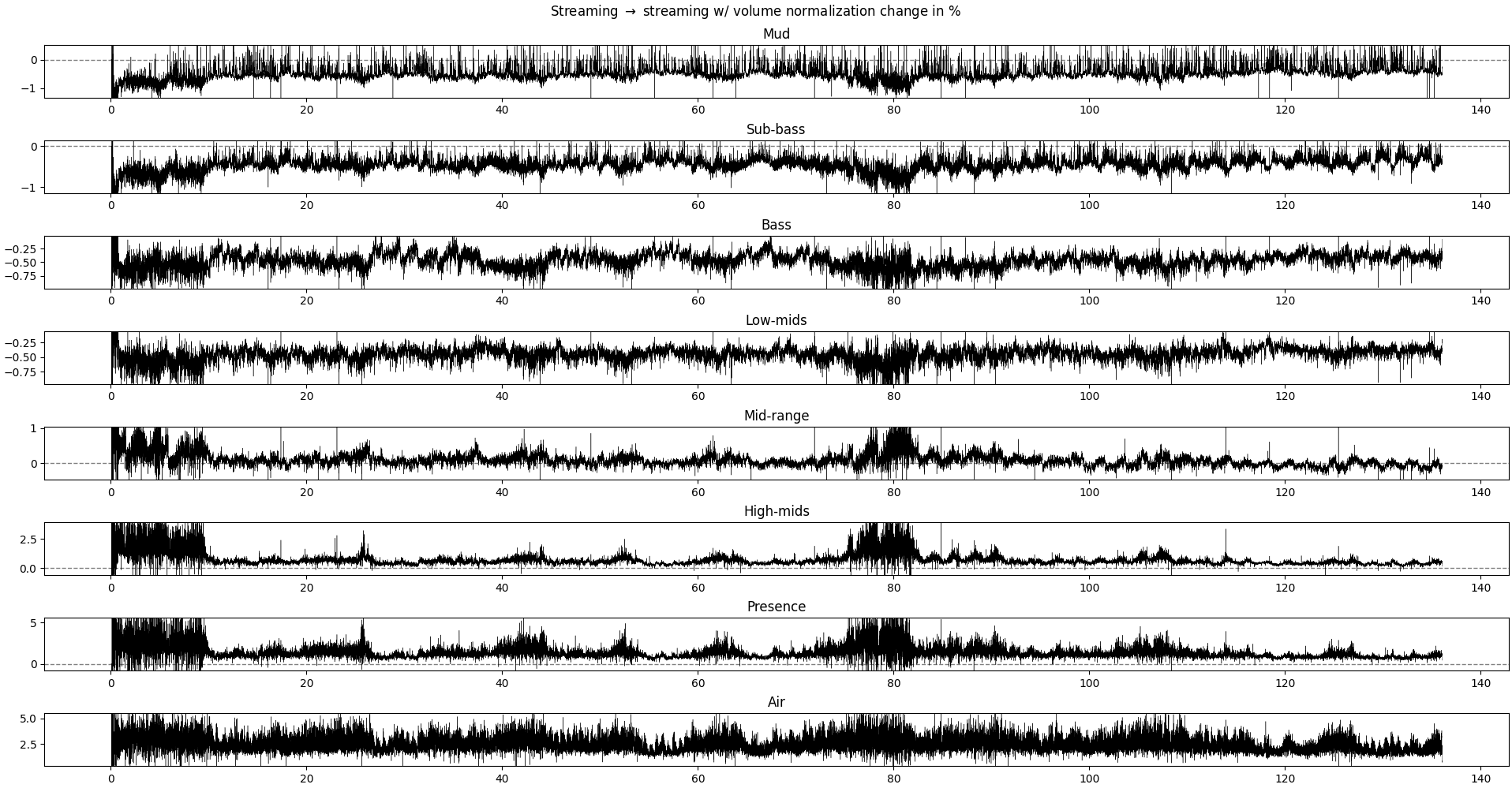 What we’re tying to get here is if some frequency band gets sacrificed for another and if so, when. Interestingly, some of the big changes happen when the music shifts from loud to quiet and vice-verse, but not always. Lower frequencies respond more to these big changes than mids and treble.