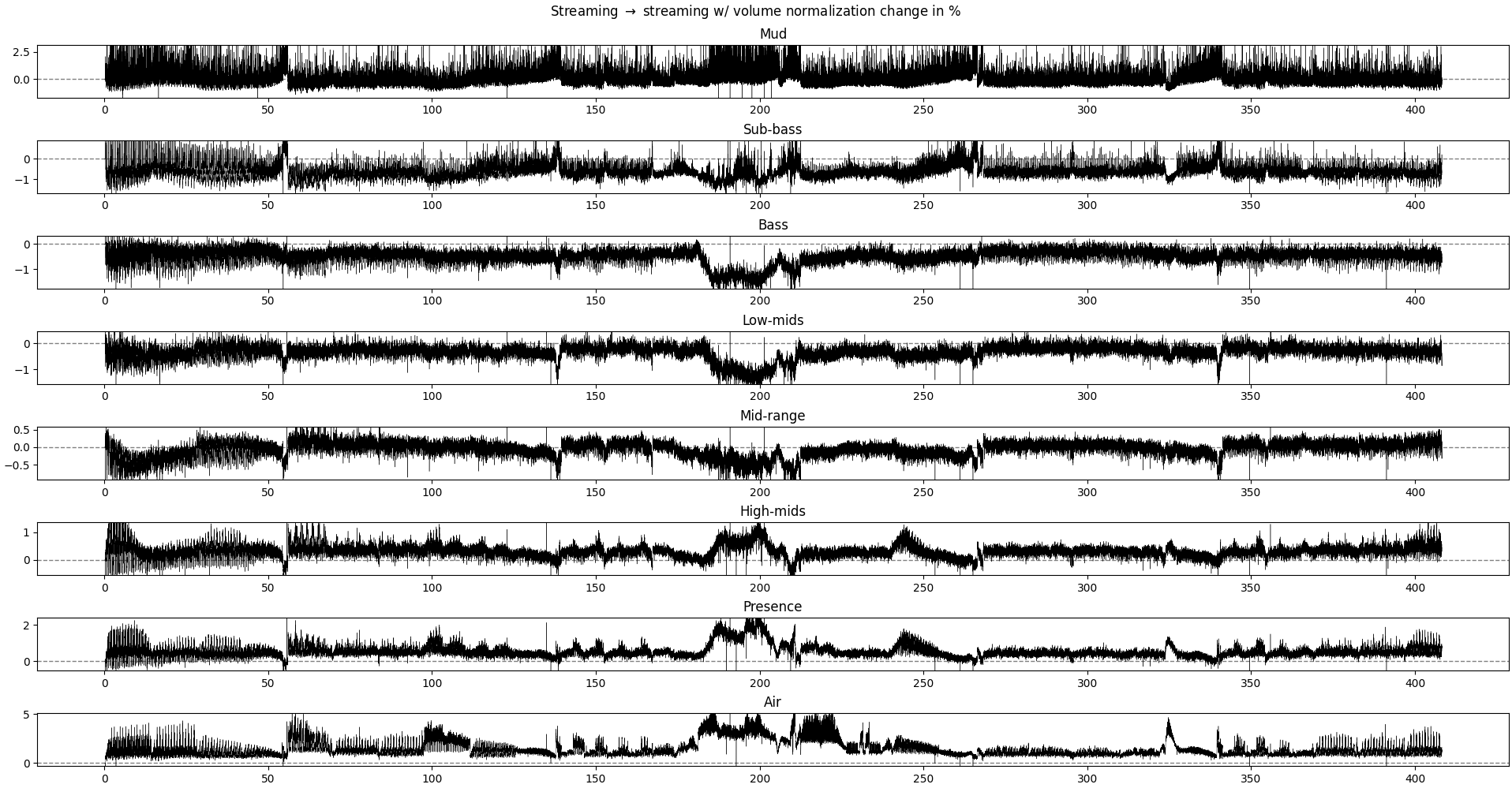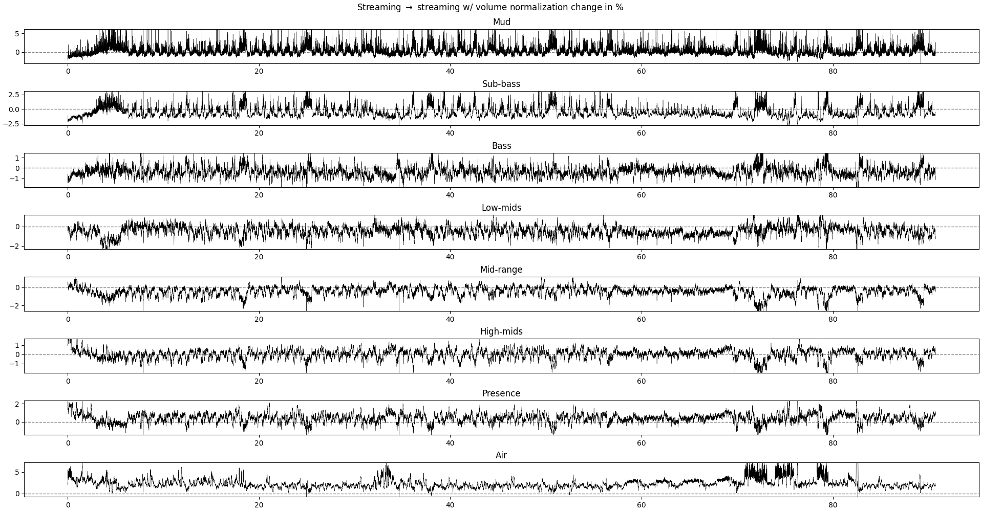 What we could expect if the volume normalization operation is a simple rescaling of the signal, without modulation across time, would be a (near-)1zero difference in all frequency bands, as we are looking at the relative power in each frequency band. The overall power may change, but not its distribution across frequencies.