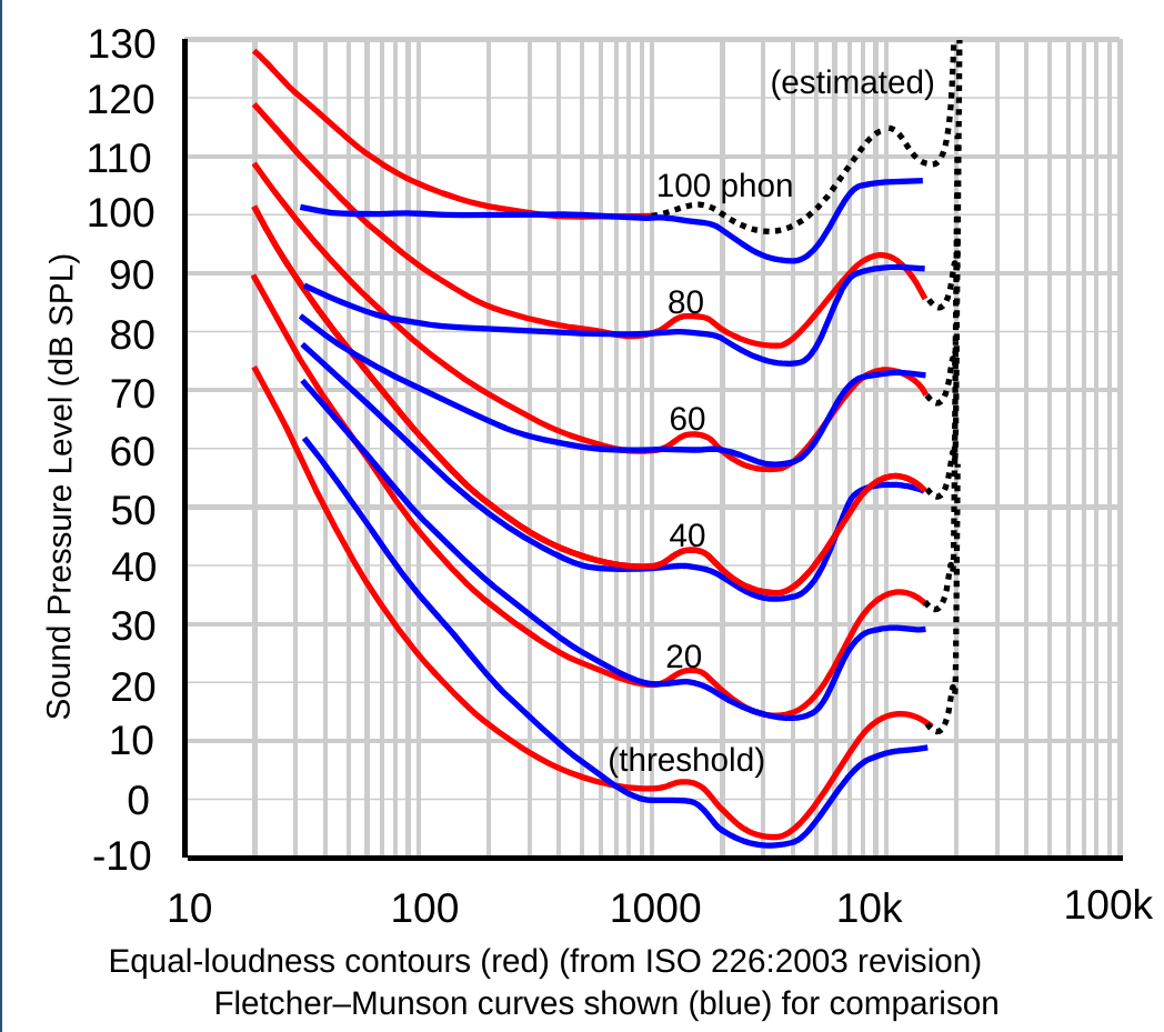 An idea as to why quiet parts have their trebled empowered while their bass is dimished is psychoacoustics. The human ear does not process all frequencies the same. After all, we’re mainly “designed” to react to human speech and nature sounds, which lie mostly in the mids. So, psychoacoustic research gives us some insight as to how sensitive we are to some frequencies compared to others. The subject is quite vast, and prone to refinements ad infinitum, so we’ll only consider one aspect of it: equal-loudness contours.