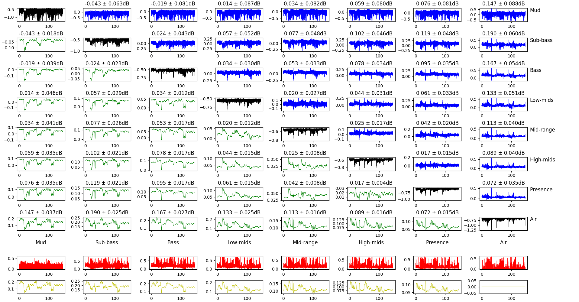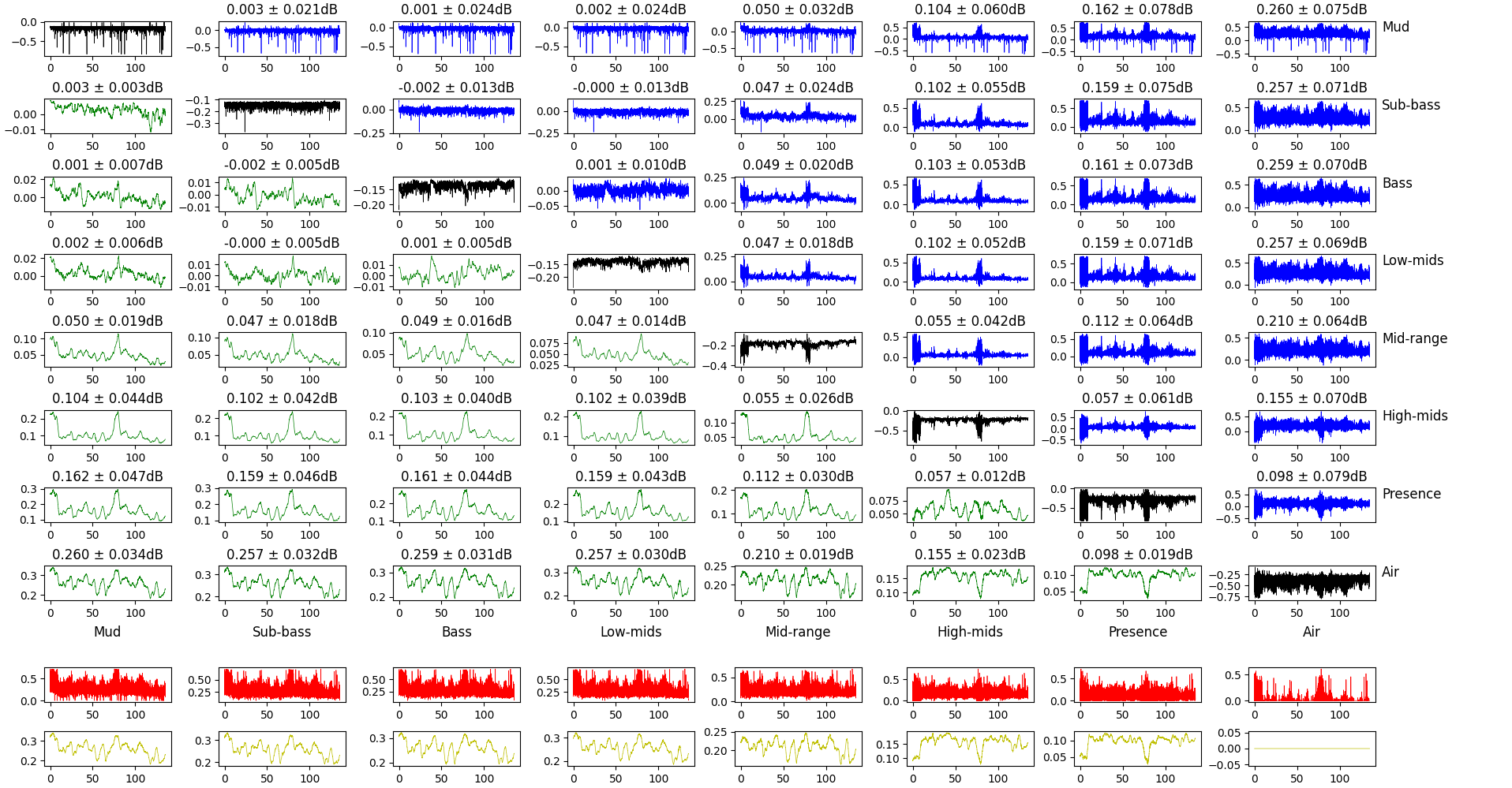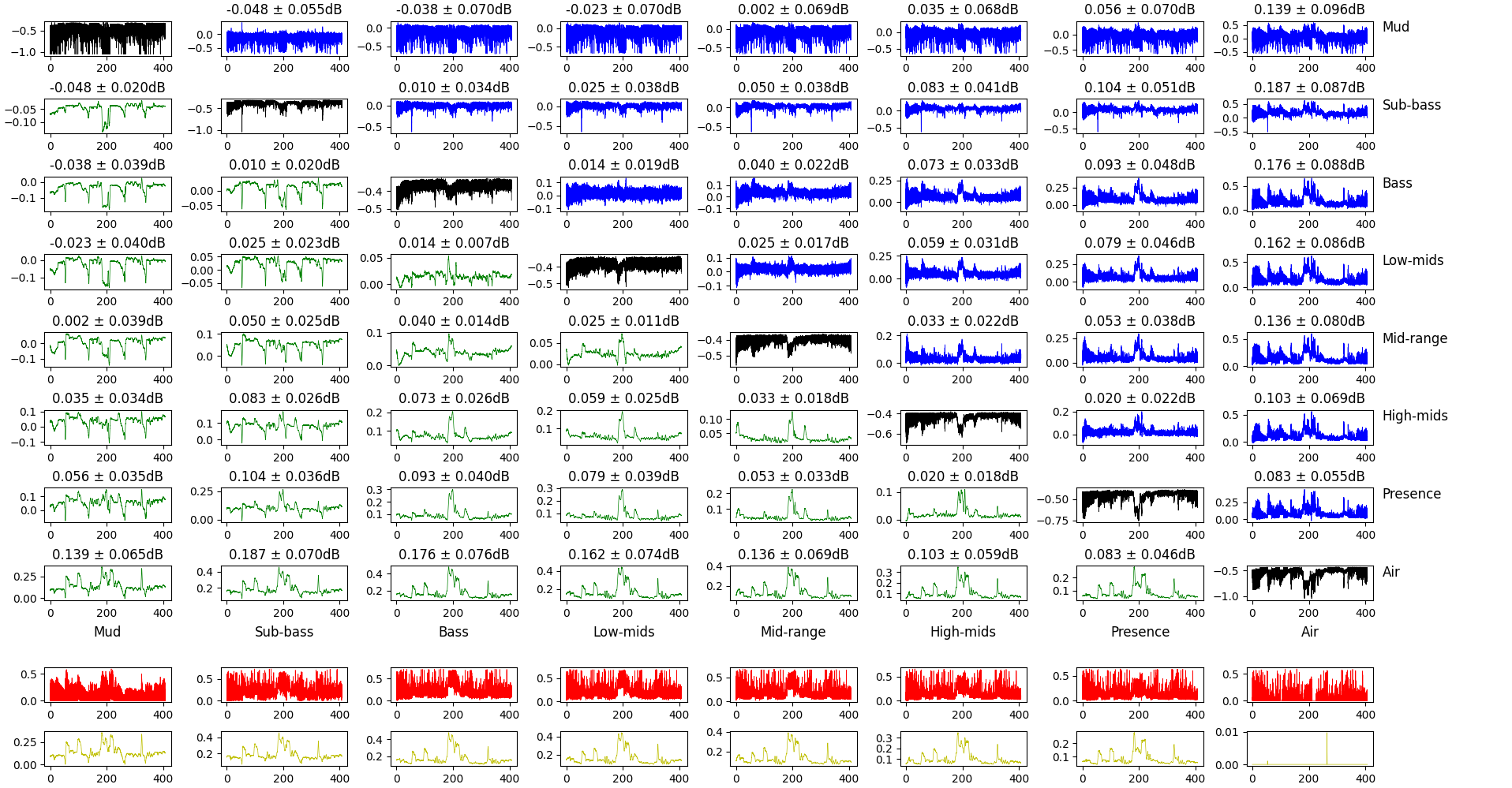 The bottom rows show the maximum difference of the gain for this frequency band and all the others. Raw for the top one, smoothed over 20ms for the bottom one.