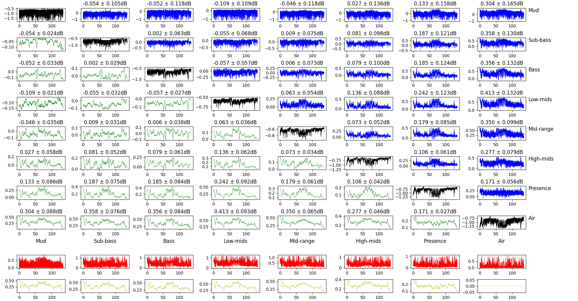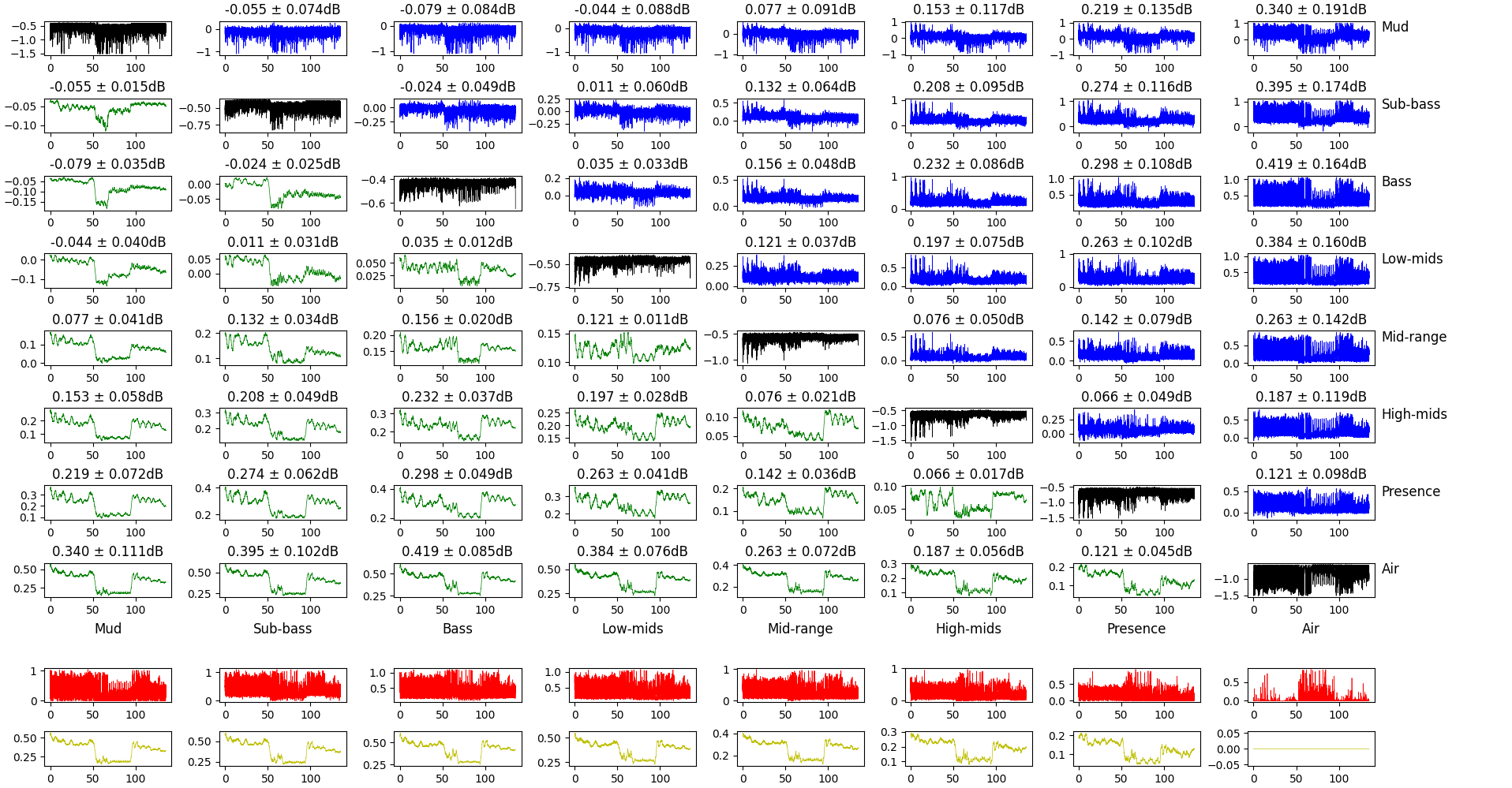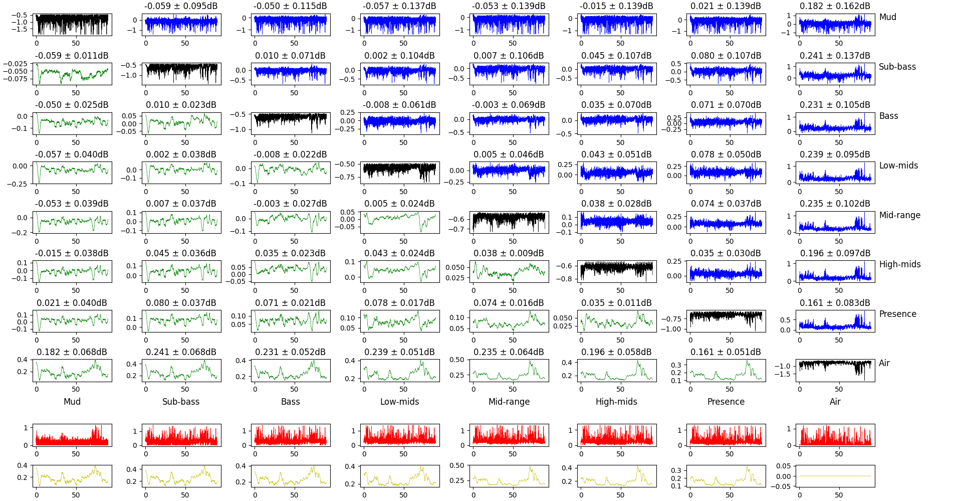 The bottom rows show the maximum difference of the gain for this frequency band and all the others. Raw for the top one, smoothed over 20ms for the bottom one.