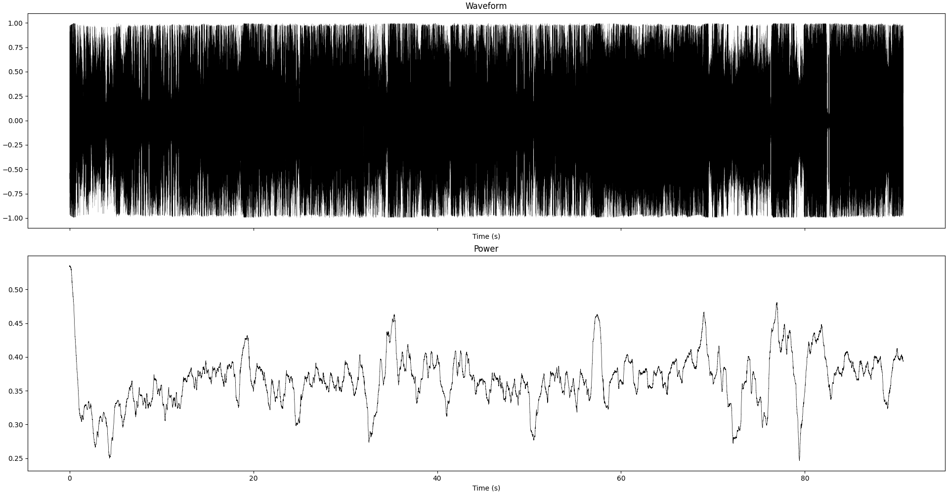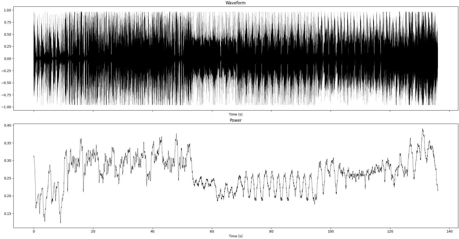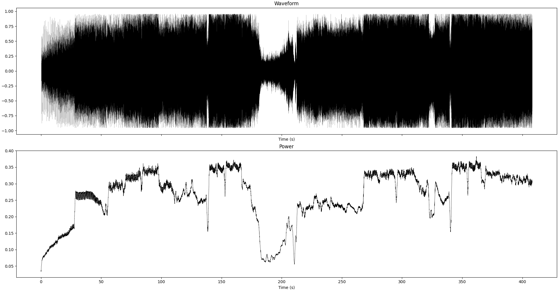 Waveform and instantaneous power (smoothed over 1sec) of the recording we study in this section