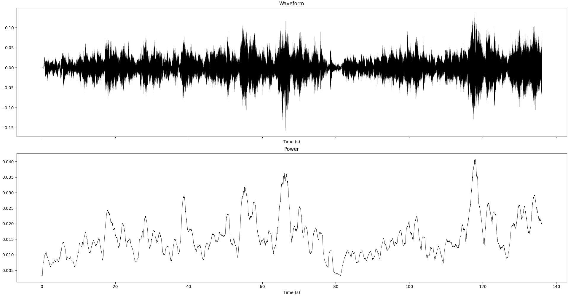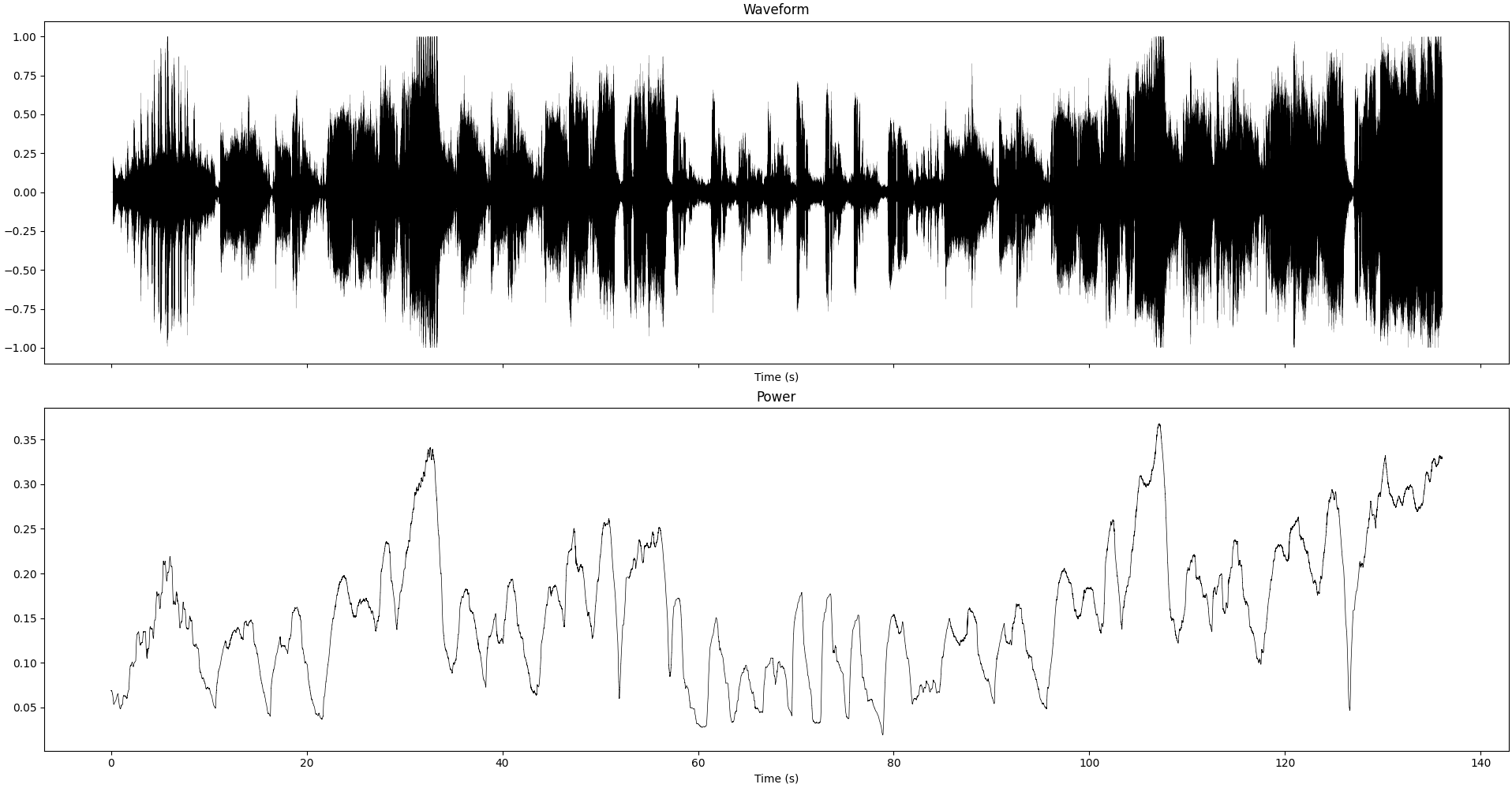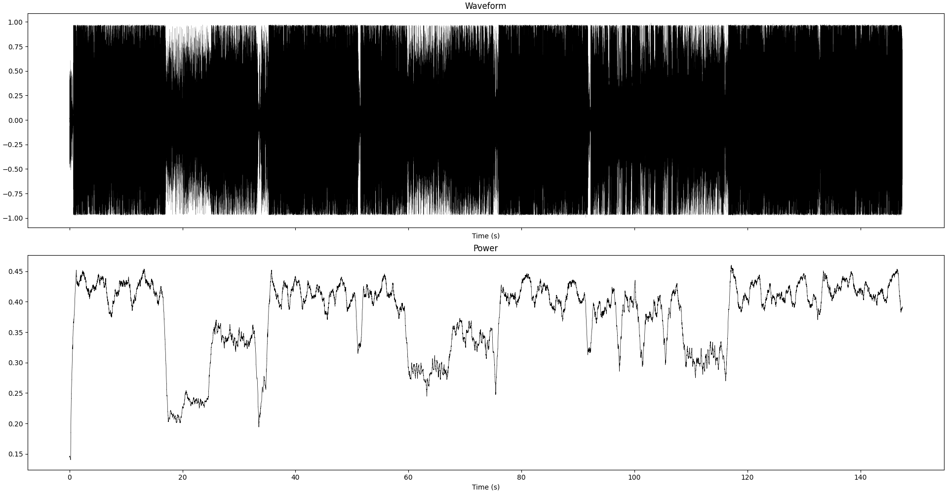 Waveform and instantaneous power (smoothed over 1sec) of the recording we study in this section